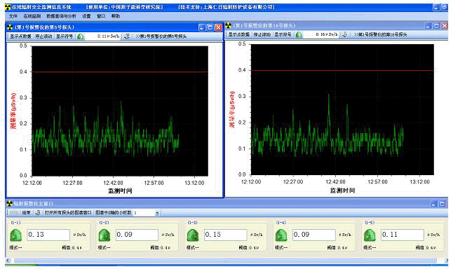 本系統(tǒng)以工業(yè)控制計(jì)算機(jī)作為上位機(jī),通過由5芯屏蔽電纜線連接的RS-485通訊網(wǎng)絡(luò),來實(shí)時(shí)采集安裝在現(xiàn)場的若干臺REN300在線輻射安全報(bào)警儀和多個(gè)不同量程的X、γ、中子射線探頭.通過對采集數(shù)據(jù)的加工處理,系統(tǒng)以文本數(shù)字、動態(tài)圖形曲線、動態(tài)圖形符號、動態(tài)顏色、報(bào)警聲音的方式向管理人員和現(xiàn)場工作人員呈現(xiàn)輻射現(xiàn)場的劑量率信息。同時(shí)在保證系統(tǒng)穩(wěn)定運(yùn)行的前提下,系統(tǒng)能連續(xù)保存30個(gè)輻射探頭5年以上的歷史數(shù)據(jù),為輻射環(huán)境評價(jià)提供重要的數(shù)據(jù)依據(jù).此外系統(tǒng)還提供對歷史的報(bào)警數(shù)分析報(bào)表、平均劑量率分析報(bào)表等統(tǒng)計(jì)分析功能。本系統(tǒng)是一套成熟的、完善的、實(shí)用的系統(tǒng),已在多個(gè)地方安裝并運(yùn)行。